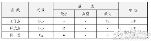 在外磁場的作用下,當磁感應強度超過導通閾值BOP 時,霍爾電路輸出管導通,輸出低電平。之后B 再增加,電路仍保持導通態(tài)。若外加磁場的B 值降低到BRP 時,輸出管截止,輸出高電平。我們稱BOP 為工作點,BRP 為釋放點,BOP-BRP=BH 稱為回差。回差的存在使開關電路的抗干擾能力增強。
