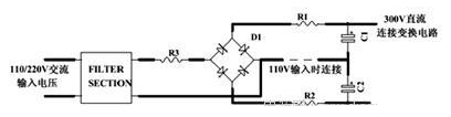 上圖所示為串連電阻法沖擊電流控制電路(適用于橋式整流和倍壓電路,其沖擊電流相同),對(duì)于110V、220V雙電壓輸入電路,應(yīng)該在R1和R2位置放兩個(gè)電阻,這樣在110V輸入連接線連接時(shí)和220V輸入連接線斷開時(shí)的沖擊電流一樣大。對(duì)于單輸入電壓電路,應(yīng)該在R3位置放電阻。