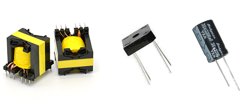 采用變壓器方式的使用元件如下圖所示:從左往右依次為變壓器、整流器、電解電容。