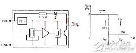 在外磁場的作用下,當磁感應強度超過導通閾值BOP 時,霍爾電路輸出管導通,輸出低電平。之后B 再增加,電路仍保持導通態(tài)。若外加磁場的B 值降低到BRP 時,輸出管截止,輸出高電平。我們稱BOP 為工作點,BRP 為釋放點,BOP-BRP=BH 稱為回差。回差的存在使開關電路的抗干擾能力增強。
