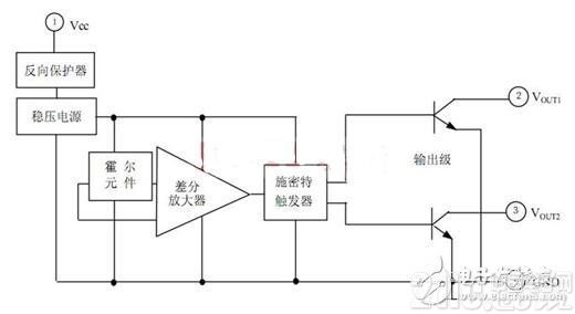 霍爾開關(Hall switch)又稱霍爾數(shù)字電路,是一種新型的電器配件,由反向電壓保護器、精密電壓調(diào)節(jié)器、霍爾電壓發(fā)生器、差分放大器、施密特觸發(fā)器、溫度補償器和互補型集電極開路輸出器等七部分組成,具有無觸點、低功耗、長使用壽命、響應頻率高等特點,內(nèi)部采用環(huán)氧樹脂封灌成一體化,能在各類惡劣環(huán)境下可靠的工作。該電路由于具有高達400 mA的負載能力,并且是互補型輸出,因此,它是無刷風扇最理想的器件。