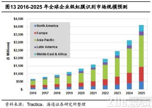 從終端市場來看,據(jù)數(shù)據(jù)顯示,2016 年全球企業(yè)級虹膜識別終端出貨量1070萬臺,預計到2025年出貨量將達到6160萬臺,復合年均增速為19.1%,對應市場規(guī)模將從2016年的6.77億美元增長至2025年的41億美元,復合年均增速19.7%。其中,2020年市場規(guī)模約為13.5億美元。