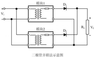二極管并聯(lián)法如上圖所示:在模塊輸出端接二極管再并聯(lián),這種電源設(shè)計方案可以防止輸出電流逆流,形成內(nèi)環(huán)路。