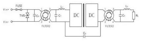 這種方案可防止前級電源對模塊的干擾,同時可隔斷模塊自身產(chǎn)生噪聲對前級電路的影響。在高要求的場合可在輸入輸出端加上濾波LC,可以有效地抑制模塊紋波噪音。但其濾波電路參數(shù)的選擇要適當,如輸出電容值C2要避免過大,防止模塊啟動不良或損壞。