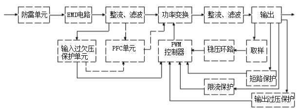開關(guān)電源模塊主要電路是由輸入EMI、整流濾波電路、功率變換電路、PWM控制器電路、輸出整流濾波電路等組成。詳細(xì)如下圖所示:
