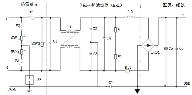 防雷電路:當(dāng)有雷擊產(chǎn)生高壓經(jīng)過電網(wǎng)進(jìn)入電源時(shí),由MOV1、MOV2、MOV3和F1、F2、F3、FDG1組成的電路進(jìn)行保護(hù)。當(dāng)加在壓敏電阻兩端的電壓超過其工作電壓時(shí),其阻值降低,使高壓能量消耗在壓敏電阻上,若電流過大,F1、F2、F3會(huì)燒毀保護(hù)后級(jí)電路。