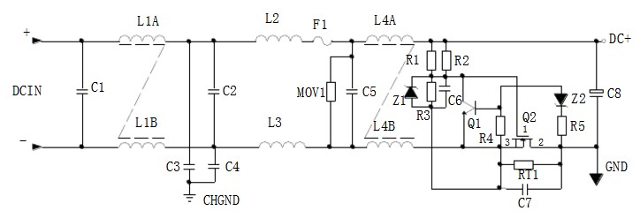 C1、L1、C2組成輸入濾波電路,跟上述的AC輸入濾波電路的作用是一樣的,R1、R2、R3、Z1、C6、Q1、Z2、R4、R5、Q2、RT1、C7組成抗浪涌電路。在起機(jī)的瞬間,由于C6的存在Q2不導(dǎo)通,電流經(jīng)RT1構(gòu)成回路。在起機(jī)的瞬間電流在RT1上產(chǎn)生的壓降增大,Q1導(dǎo)通使Q2沒有柵極電壓不導(dǎo)通,RT1將會(huì)在很短時(shí)間燒毀,以保護(hù)后級(jí)電路。