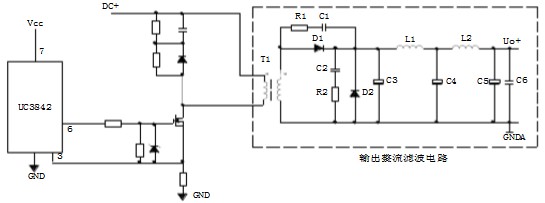 上圖為正激式輸出整流濾波電路:T1為開關(guān)變壓器,其初極和次極的相位同相。D1為整流二極管,D2為續(xù)流二極管,R1、C1、R2、C2為削尖峰電路。L1為續(xù)流電感,C4、L2、C5組成π型濾波器。