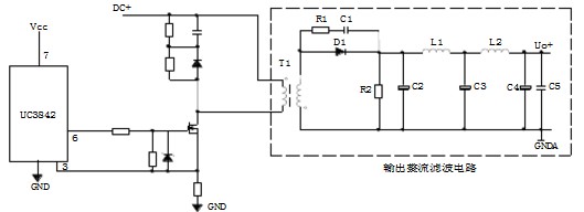 上圖為反激式輸出整流濾波電路:T1為開關(guān)變壓器,其初極和次極的相位相反。D1為整流二極管,R1、C1為削尖峰電路。L1為續(xù)流電感,R2為假負(fù)載,C4、L2、C5組成π型濾波器。