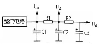 RC濾波如上圖所示:電路中的C1、C2和C3是濾波電容,R1和R2是濾波電阻,C1、R1 和C2 構(gòu)成第一節(jié)π型的RC濾波電路,后面為第二節(jié)。從整流電路輸出的電壓會先經(jīng)過C1的濾波,將大部分交流成分濾除,再到R1和C2構(gòu)成的濾波電路中。C2的容抗與R1構(gòu)成一個分壓電路,因C2的容抗很小,所以對交流成分的分壓衰減量很大,達到濾波目的。對于直流電而言,由于C2具有隔直作用,所以R1和C2分壓電路對直流不存在分壓衰減的作用,直流電壓通過 R1 輸出。