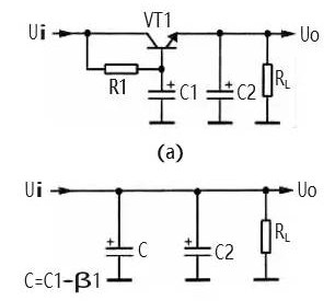 濾波器電路如上圖所示:電路中的VT1是三極管,起到濾波管作用,C1是VT1的基極濾波電容,R1是VT1的基極偏置電阻,RL是這一濾波電路的負載,C2是輸出電壓的濾波電容。電路中的R1和C1構(gòu)成RC濾波電路,R1一方面為VT1提供基極偏置電流,同時也是濾波電阻。由于流過R1的電流是VT1的基極偏置電流,電流很小,而R1的阻值可以取得比較大,這樣R1和C1的濾波效果就很好,使VT1基極上直流電壓中的交流成分很少。發(fā)射極電壓具有跟隨基極電壓的特性,于是VT1發(fā)射極輸出電壓中交流成分也很少,從而達到濾波目的。