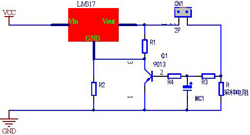 采樣電阻獲取限流信號保護(hù),如上圖是LM317限流保護(hù)電路,2P的連接器接負(fù)載,其中R是采樣電阻,一旦電流過大,電容MC1充電,充電大于達(dá)到三極管9013的導(dǎo)通電壓,LM317的輸出電壓降至它的基準(zhǔn)電壓之下,也可就是1.25V左右,從而保護(hù)負(fù)載。