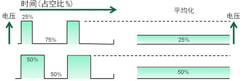 上圖是利用代表性的控制方式PWM(Pulse Width Modulation:脈沖寬度調(diào)制)方式加以降壓的原理。PWM是指讓周期(頻率)保持恒定,調(diào)整ON和OFF的時(shí)間比,也就是占空比來(lái)進(jìn)行控制的方法,能運(yùn)用在開(kāi)關(guān)電源、電源模塊等多種應(yīng)用上。采用PWM時(shí),經(jīng)由開(kāi)關(guān)將DC電壓轉(zhuǎn)換成達(dá)到必要占空比的AC后,接著再進(jìn)行整流回到DC,以取得想要的DC電壓。例如經(jīng)由開(kāi)關(guān)將100VDC轉(zhuǎn)換成周期25%ON、剩下OFF的25:75的AC。接著,整流-平滑該AC,也即將其均勻化后轉(zhuǎn)換成DC,電壓就會(huì)轉(zhuǎn)換成相當(dāng)于25%的25VDC。