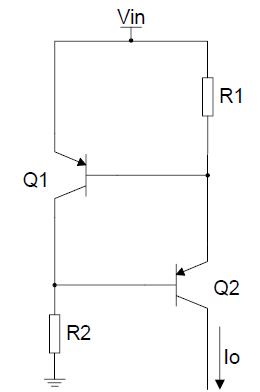 電路1:由兩個同型號的三極管,根據(jù)三極管Vbe電壓相對穩(wěn)定,以及三極管的基極電流相對集電極電流較小的特點,組成一個電流相對恒定的恒流源,電流Io=Vbe/R1。這個恒流源沒有用到特殊器件,兩個三極管和兩個電阻組成,成本低,電流Io可調(diào)。缺點是Vbe的大小會隨電流及溫度的變化而變化,電流大Vbe大,溫度低Vbe大,所以不適合用在精度要求高的地方。